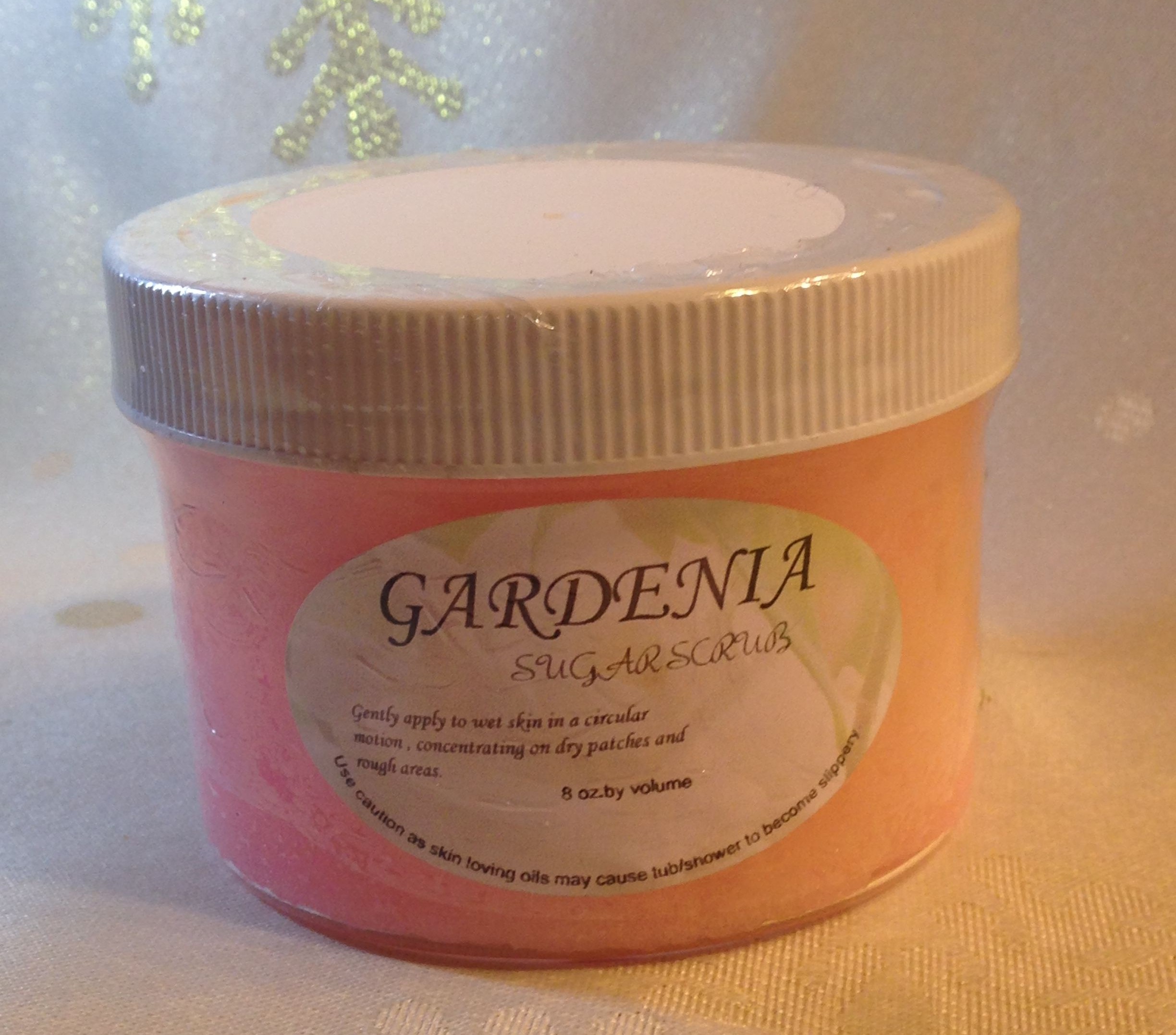 Gardenia Emulsified Sugar Scrub This sugar scrub is not like others in that it is not the gloopy, oily mess we see in retail markets. This is a hand crafted emulsified scrub that is so thick you can turn it upside down without it leaking or spilling out!! And...when used, turns a milky white with the sugar crystals gently ex-foliating your skin to leave you not only silky smooth and soft but smelling wonderful. Gently apply to wet skin in a circular motion with cloth or sponge , concentrating on dry and rough areas. Please use caution when exiting the tub/shower as skin loving oils may leave the area slippery. 8 oz. by volume.